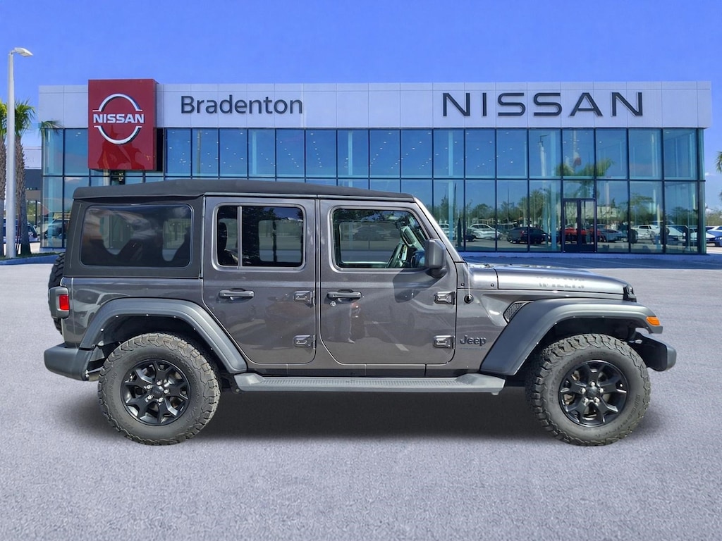 8.4 Radio & Premium Audio Group (1-Year SiriusXM Guardian Trial, 220 Amp Alternator, 4G LTE Wi-Fi Hot Spot, 5-Year SiriusXM Traffic Service, 8.4 Touchscreen Display, Alpine Premium Audio System, Apple CarPlay, Auto-Dimming Rear-View Mirror, Emergency/Assistance Call, Google Android Auto, GPS Antenna Input, GPS Navigation, HD Radio, Integrated Center Stack Radio, Integrated Voice Command w/Bluetooth, Off-Road Info Pages, Radio: Uconnect 4C Nav w/8.4 Display, SiriusXM Satellite Radio, SiriusXM Traffic Plus, SiriusXM Travel Link, and USB Host Flip), Quick Order Package 25W Willys (4-Wheel Drive Swing Gate Decal, Anti-Spin Differential Rear Axle, Black Grille, Front 1-Touch Down Power Windows, MOPAR All-Weather Floor Mats, Sun Visors w/Illuminated Vanity Mirrors, Willys, and Willys Hood Decal), Technology Group (2-Door Passive Entry, Front Door Locks, Air Conditioning w/Auto Temperature Control, and Cluster 7.0 TFT Color Display), Certified Select Certified, 3.45 Overall Top Gear Ratio, 4-Wheel Disc Brakes, 8 Speakers, ABS brakes, Air Conditioning, AM/FM radio, Apple CarPlay/Android Auto, Aux Battery, Brake assist, Cloth Low-Back Bucket Seats, Compass, Delay-off headlights, Driver door bin, Driver vanity mirror, Dual front impact airbags, Dual front side impact airbags, Electronic Stability Control, Emergency communication system: SiriusXM Guardian, Engine Oil Cooler, Front anti-roll bar, Front Bucket Seats, Front Center Armrest w/Storage, Front fog lights, Front reading lights, Integrated roll-over protection, Low tire pressure warning, Non-Lock Fuel Cap w/o Discriminator, Normal Duty Suspension, Occupant sensing airbag, Outside temperature display, ParkView Rear Back-Up Camera, Passenger door bin, Passenger vanity mirror, Power steering, Premium Black Sunrider Soft Top, Radio data system, Radio: Uconnect 4 w/7 Display, Rear anti-roll bar, Rear reading lights, Speed control, Split folding rear seat, Steering wheel mounted audio controls, Stop-Start Dual Battery System, Tachometer, Telescoping steering wheel, Tilt steering wheel, Traction control, Trip computer, Variably intermittent wipers, Wheels: 17 x 7.5 Black Steel Styled, and Wheels: 17 x 7.5 Moab Black Aluminum (DISC)