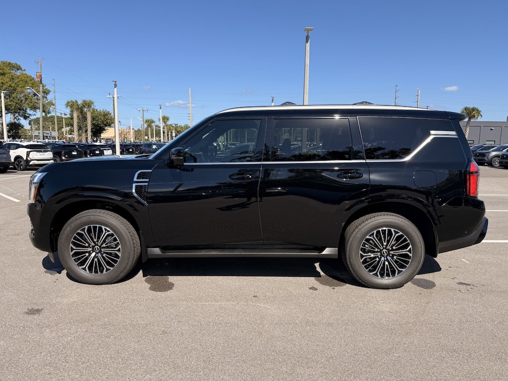 Captain's Chair Seat Package (2nd Row Center Console with Two Cupholders, 2nd Row Outboard Captain's Chairs with Armrests, and EZ Flex Second Row Seating System with One Touch Release), 4WD, 12 Speakers, 3rd row seats: split-bench, 4-Wheel Disc Brakes, ABS brakes, Air Conditioning, Alloy wheels, AM/FM radio: SiriusXM w/360L, Anti-whiplash front head restraints, Apple CarPlay/Android Auto, Auto High-beam Headlights, Auto tilt-away steering wheel, Auto-dimming door mirrors, Auto-dimming Rear-View mirror, Auto-leveling suspension, Automatic temperature control, Brake assist, Bumpers: body-color, Carpeted Floor Mats with Captain Chairs, Compass, Cross Bars, Delay-off headlights, Driver door bin, Driver vanity mirror, Dual front impact airbags, Dual front side impact airbags, Electronic Stability Control, Emergency communication system: NissanConnect Services, Four wheel independent suspension, Front anti-roll bar, Front Bucket Seats, Front Center Armrest, Front dual zone A/C, Front reading lights, Fully automatic headlights, Garage door transmitter: myQ Connected Garage, Genuine wood dashboard insert, Heated door mirrors, Heated Front Bucket Seats, Heated front seats, Heated steering wheel, HVAC memory, Illuminated entry, Knee airbag, Leather steering wheel, Low tire pressure warning, Memory seat, Navigation system: Google Maps, Occupant sensing airbag, Outside temperature display, Overhead airbag, Overhead console, Panic alarm, Passenger door bin, Passenger vanity mirror, Power door mirrors, Power driver seat, Power Liftgate, Power passenger seat, Power steering, Power windows, Radio: NissanConnect with SiriusXM 360L, Rain sensing wipers, Rear air conditioning, Rear anti-roll bar, Rear reading lights, Rear seat center armrest, Rear window defroster, Rear window wiper, Reclining 3rd row seat, Remote keyless entry, Security system, Speed control, Speed-sensing steering, Speed-Sensitive Wipers, Splash Guards, Split folding rear seat, Spoiler, Steering wheel memory, Steering wheel mounted audio controls, Tachometer, TailorFit Seat Trim, Telescoping steering wheel, Tilt steering wheel, Traction control, Trip computer, Turn signal indicator mirrors, Variably intermittent wipers, Voltmeter, and Wheels: 20 x 8.5J Machined and Painted Alloy.