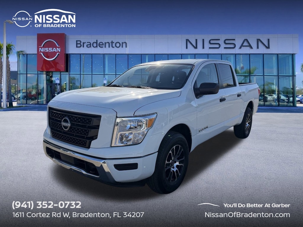 Titan SV, 4D Crew Cab, 4WD, Glacier White, 3.692 Axle Ratio, 4-Wheel Disc Brakes, 6 Speakers, ABS brakes, Air Conditioning, Alloy wheels, AM/FM radio: SiriusXM, Apple CarPlay/Android Auto, Auto High-beam Headlights, Blind Spot Warning, Brake assist, Bumpers: chrome, Cloth Seat Trim, Driver door bin, Dual front impact airbags, Dual front side impact airbags, Electronic Stability Control, Front anti-roll bar, Front Center Armrest w/Storage, Front reading lights, Front Split Bench Seat (40/20/40), Front wheel independent suspension, Fully automatic headlights, Heated door mirrors, Illuminated entry, Knee airbag, Low tire pressure warning, Occupant sensing airbag, Outside temperature display, Overhead airbag, Overhead console, Panic alarm, Passenger door bin, Passenger vanity mirror, Power door mirrors, Power steering, Power windows, Radio data system, Radio: AM/FM Audio System, Rear anti-roll bar, Rear Parking Sensors, Rear reading lights, Rear seat center armrest, Rear step bumper, Rear window defroster, Remote keyless entry, Security system, Speed control, Speed-sensing steering, Speed-Sensitive Wipers, Split folding rear seat, Steering wheel mounted audio controls, Tachometer, Telescoping steering wheel, Tilt steering wheel, Traction control, Trip computer, Variably intermittent wipers, Voltmeter, and Wheels: 18 x 8 Painted & Machined Alloy.